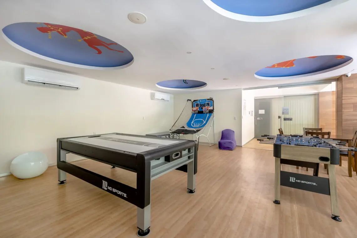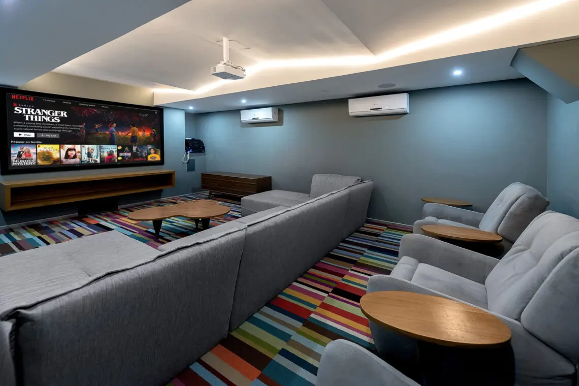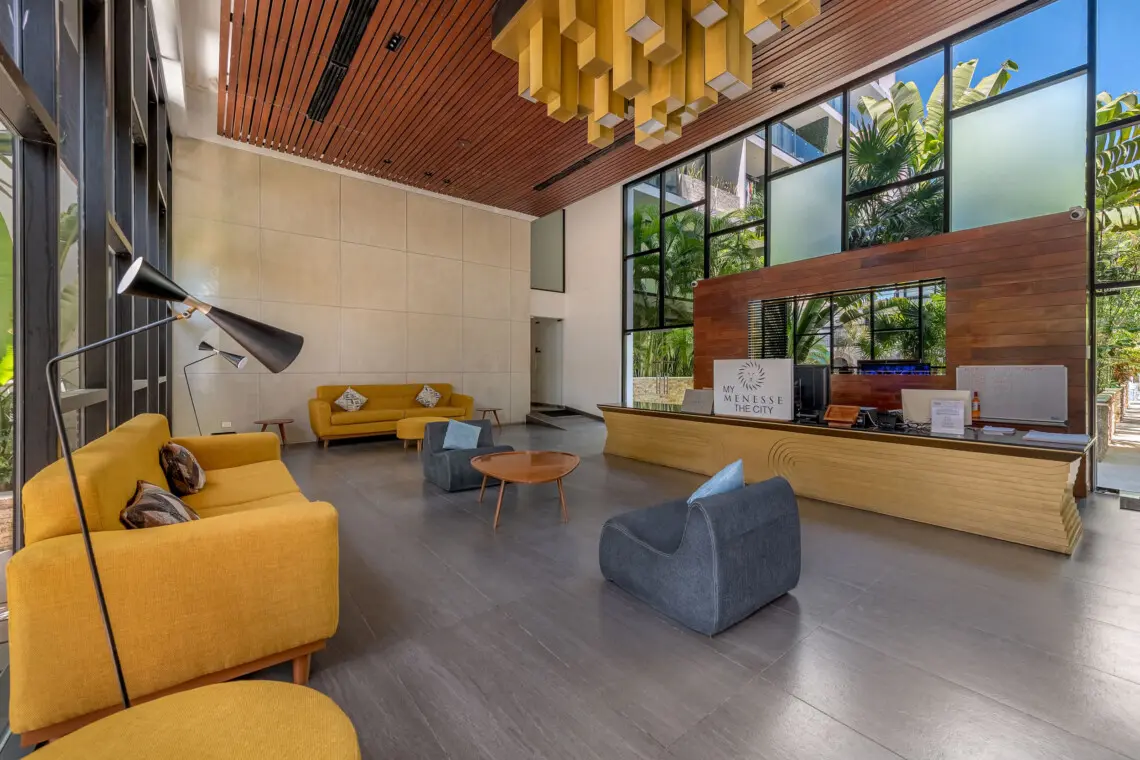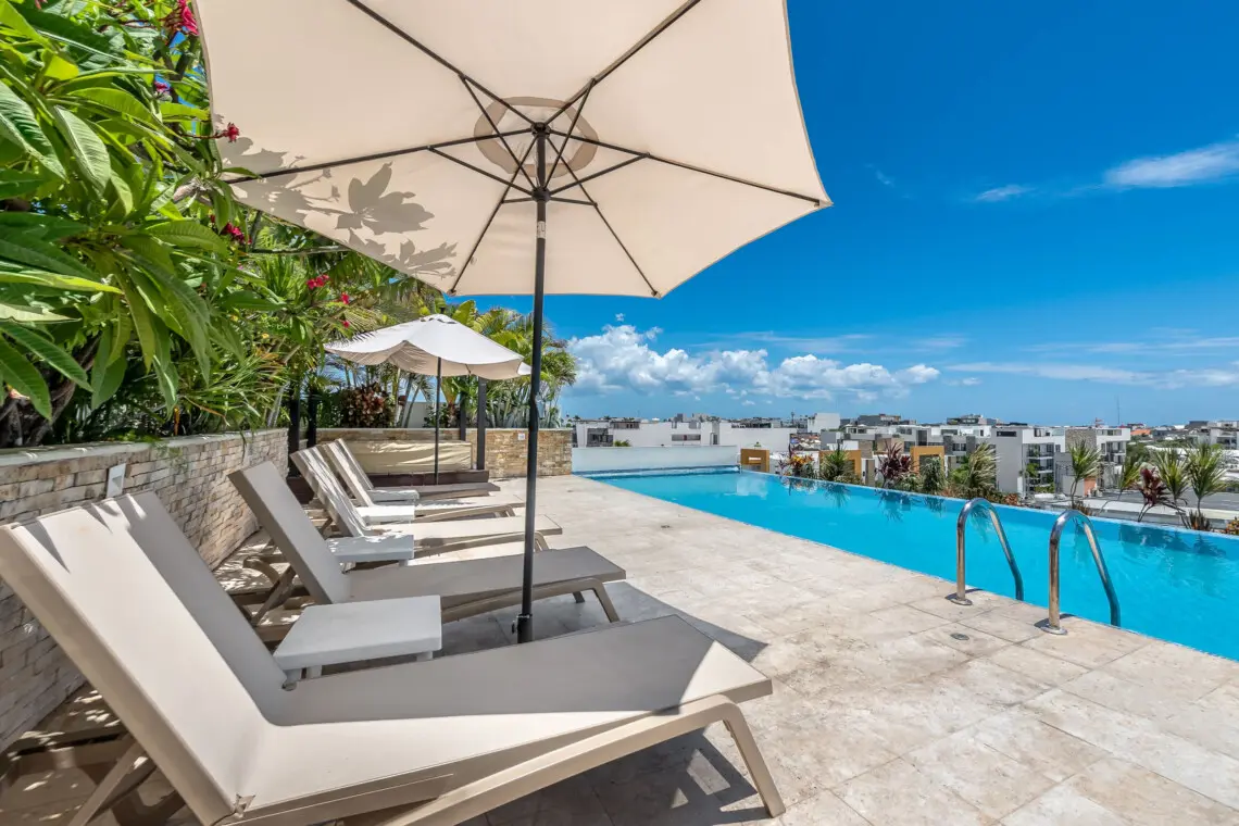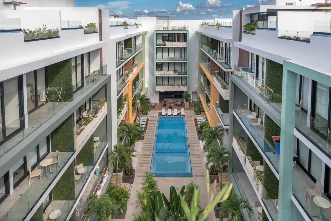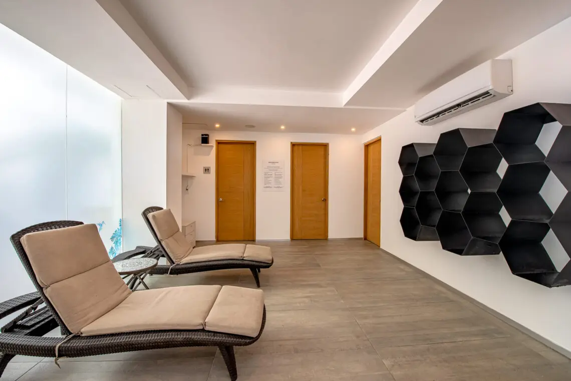 El edificio ofrece excelentes áreas comunes: dos grandes albercas (una en planta baja y otra solo para adultos en el rooftop), gimnasio, sala de cine, sauna y spa (con reservación previa), además de recepción, seguridad 24 horas y estacionamiento subterráneo gratuito.
