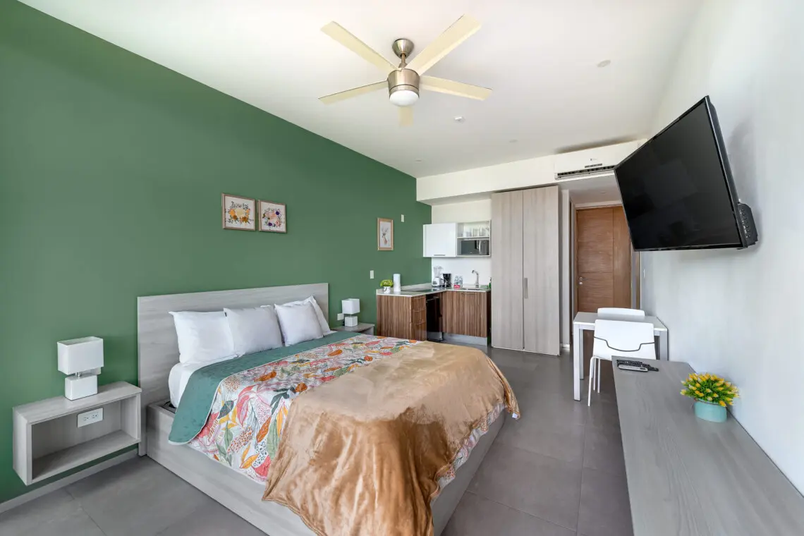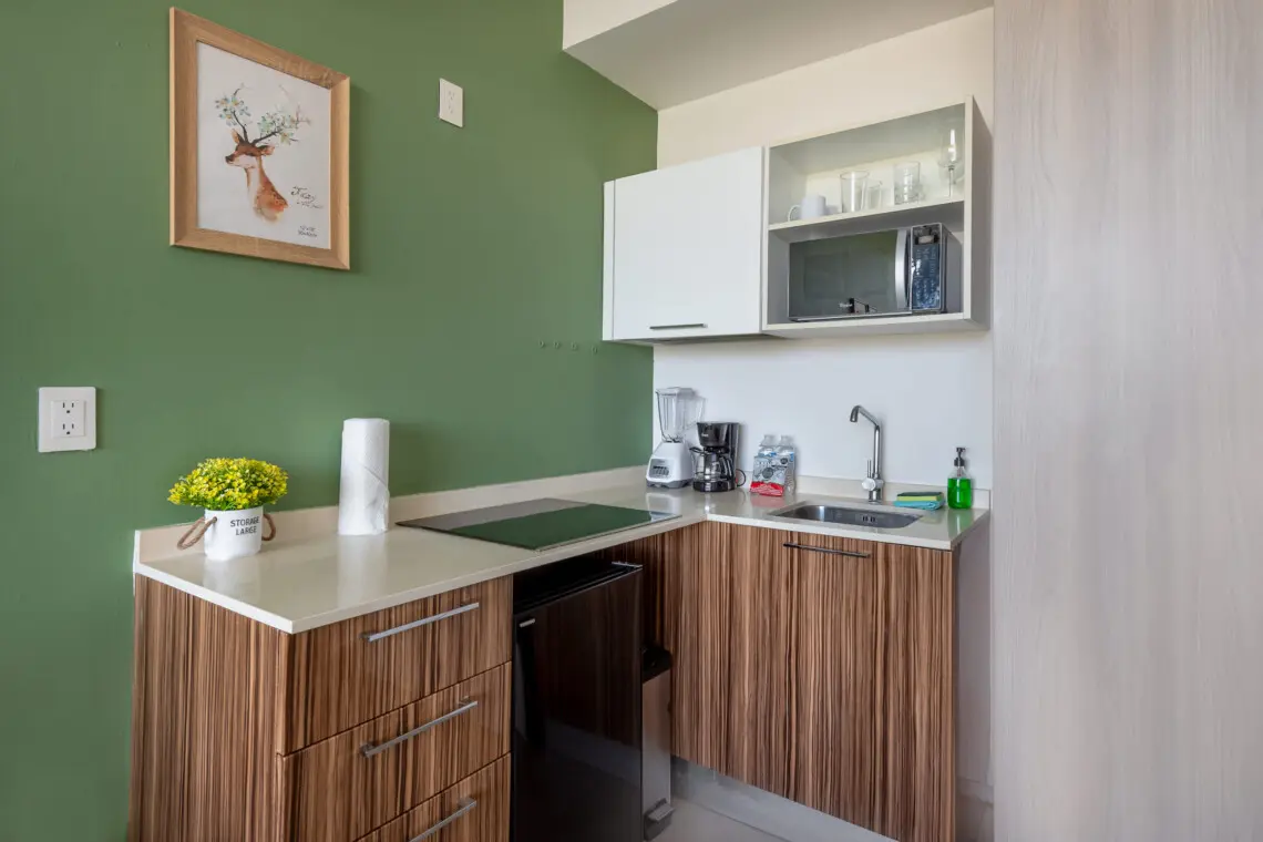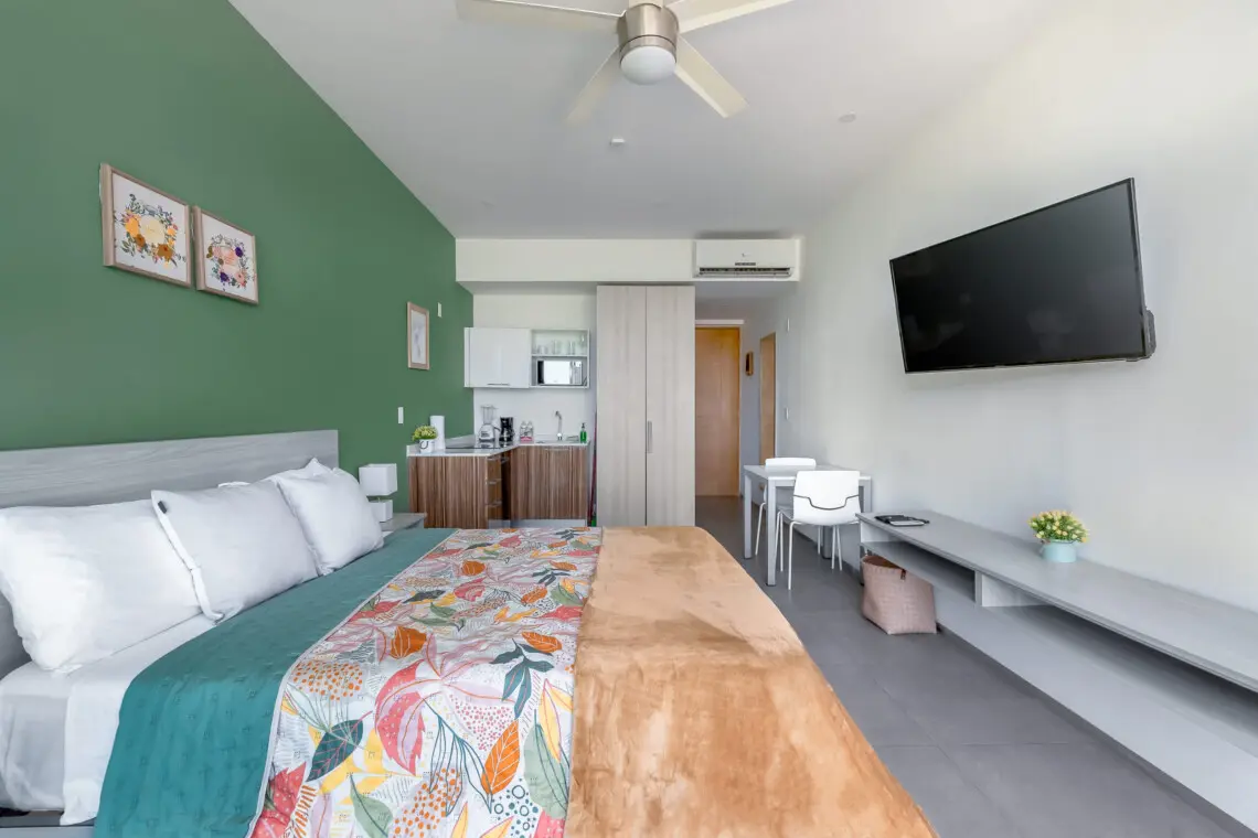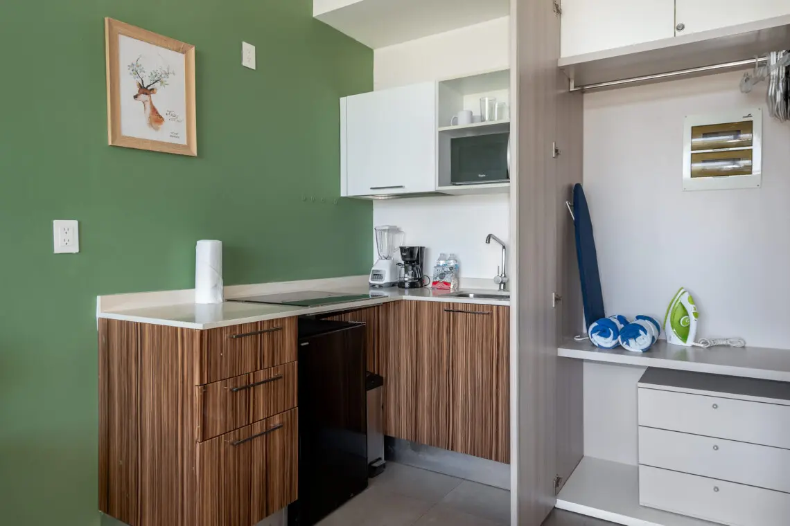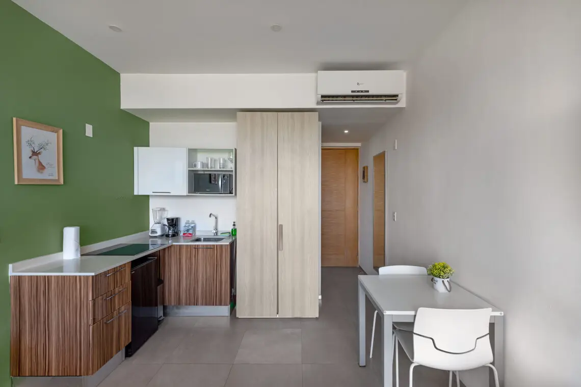 El estudio está totalmente equipado para tu comodidad. Cuenta con cama Queen Size, aire acondicionado, Smart TV, amplio clóset, caja fuerte, cocina completa con refrigerador (ver tamaño en fotos), horno de microondas, estufa de 2 hornillas, comedor para dos personas, baño privado y balcón. También ofrece internet de alta velocidad mediante fibra óptica y todos los amenities necesarios para que tu estancia sea cómoda y placentera.