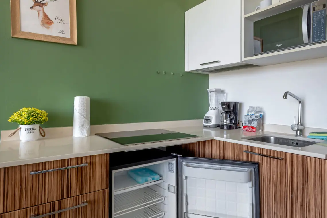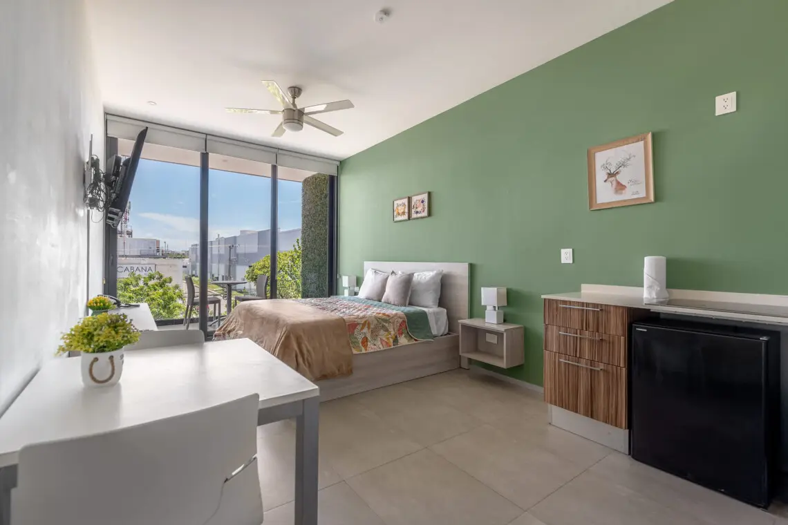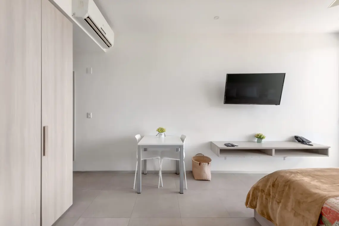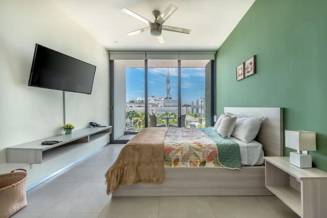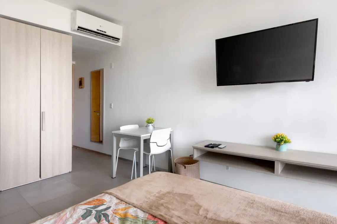 El estudio está totalmente equipado para tu comodidad. Cuenta con cama Queen Size, aire acondicionado, Smart TV, amplio clóset, caja fuerte, cocina completa con refrigerador (ver tamaño en fotos), horno de microondas, estufa de 2 hornillas, comedor para dos personas, baño privado y balcón. También ofrece internet de alta velocidad mediante fibra óptica y todos los amenities necesarios para que tu estancia sea cómoda y placentera.